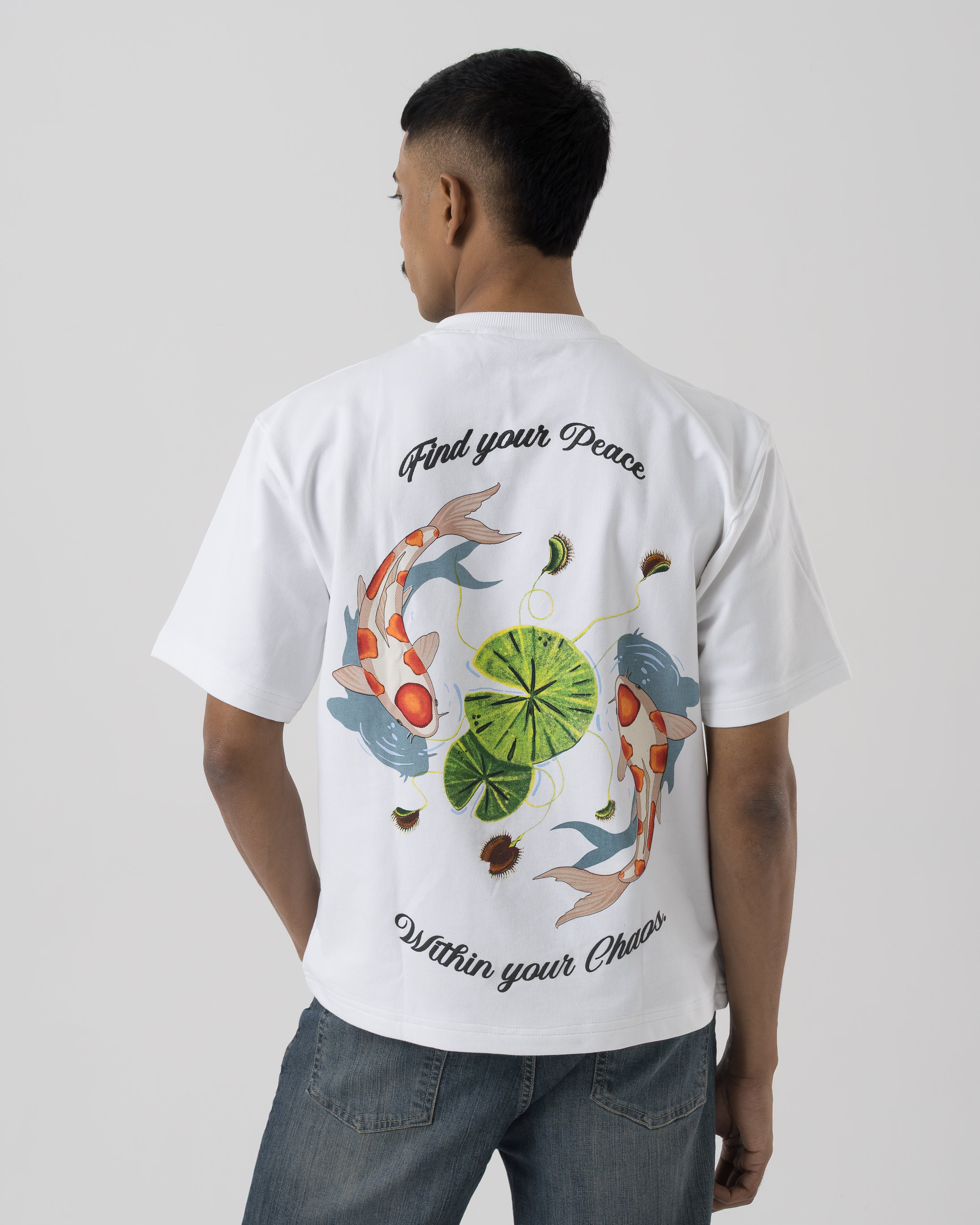 Features a minimal twin-koi Untld. emblem on the front and a large detailed koi pond artwork on the back with the message “Find your Peace Within your Chaos.” Finished with a ribbed crew neckline and a clean straight hem.