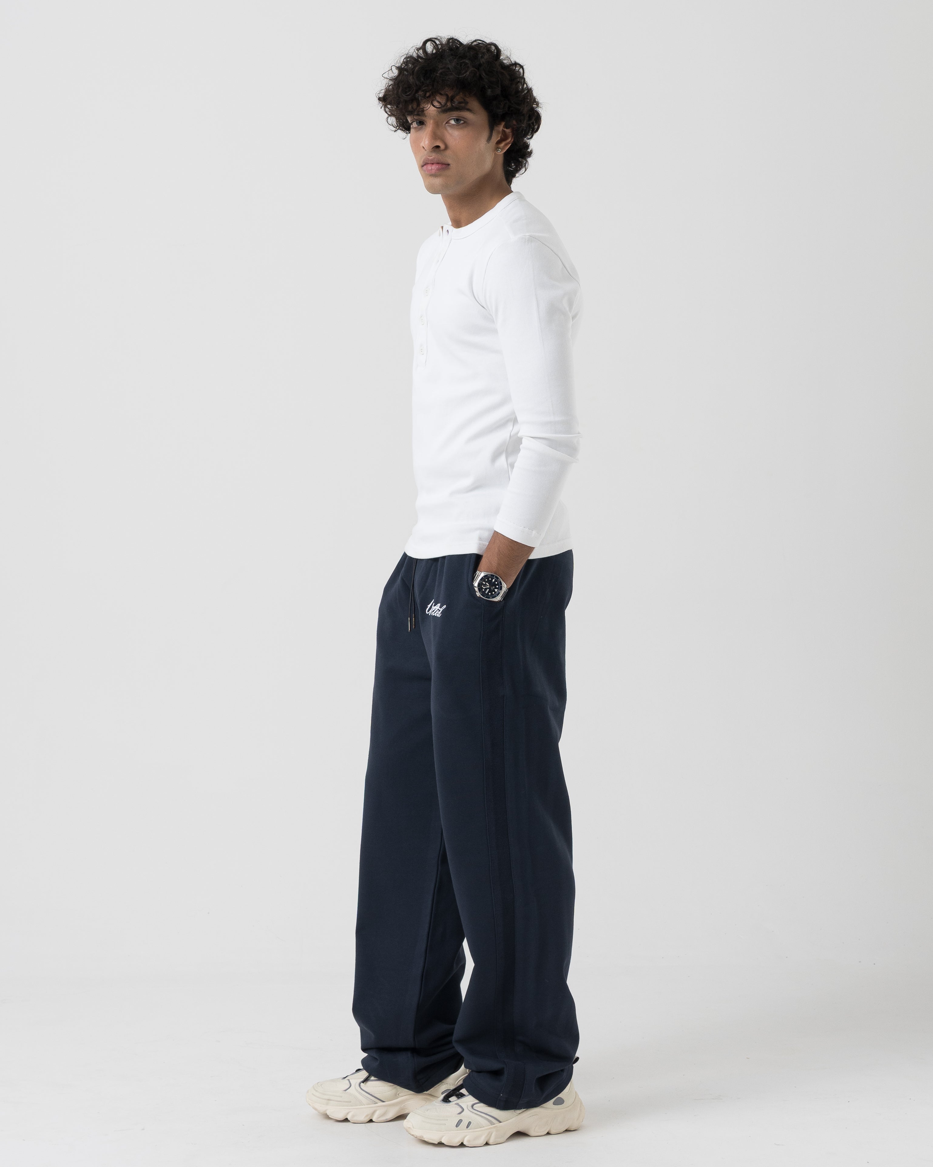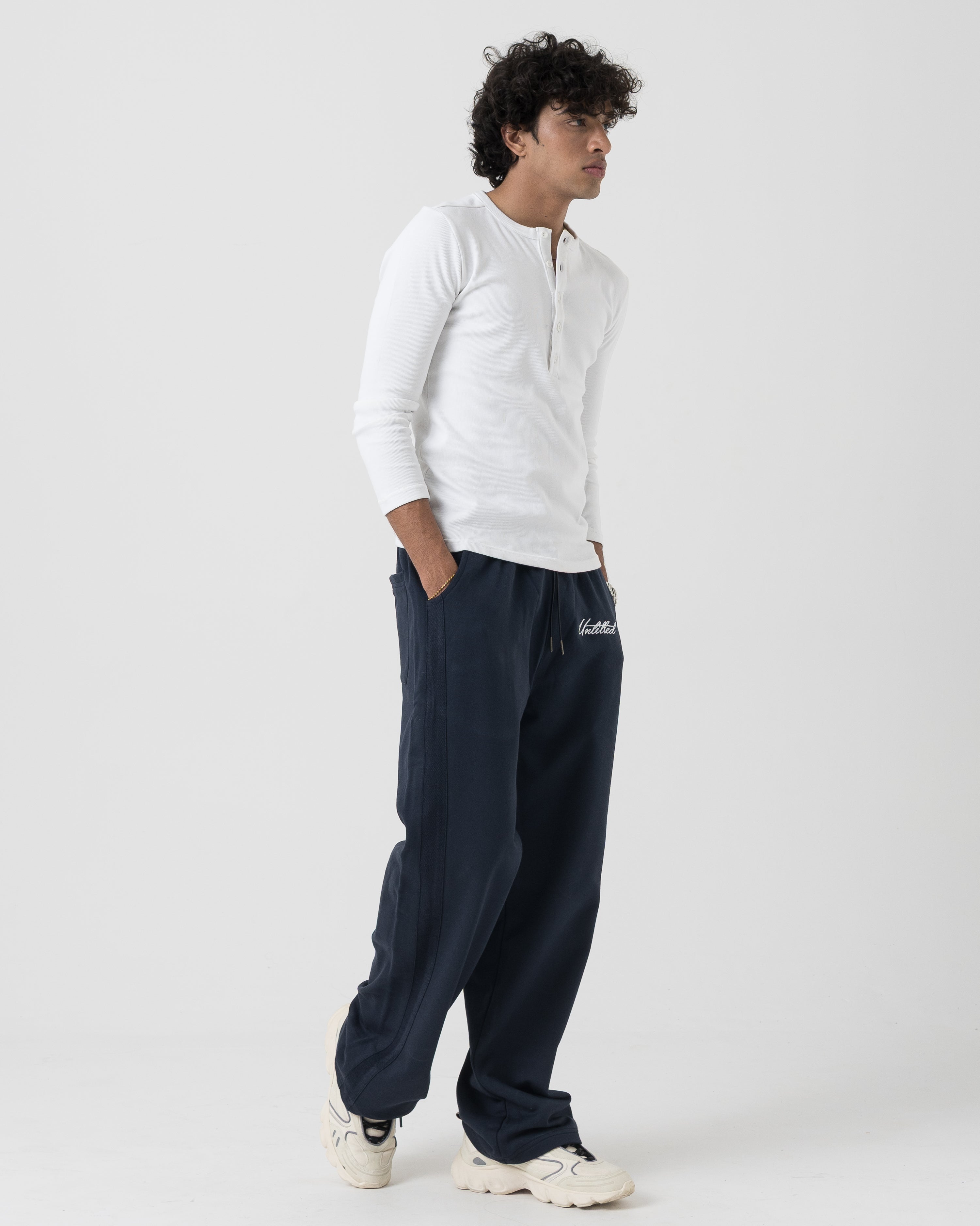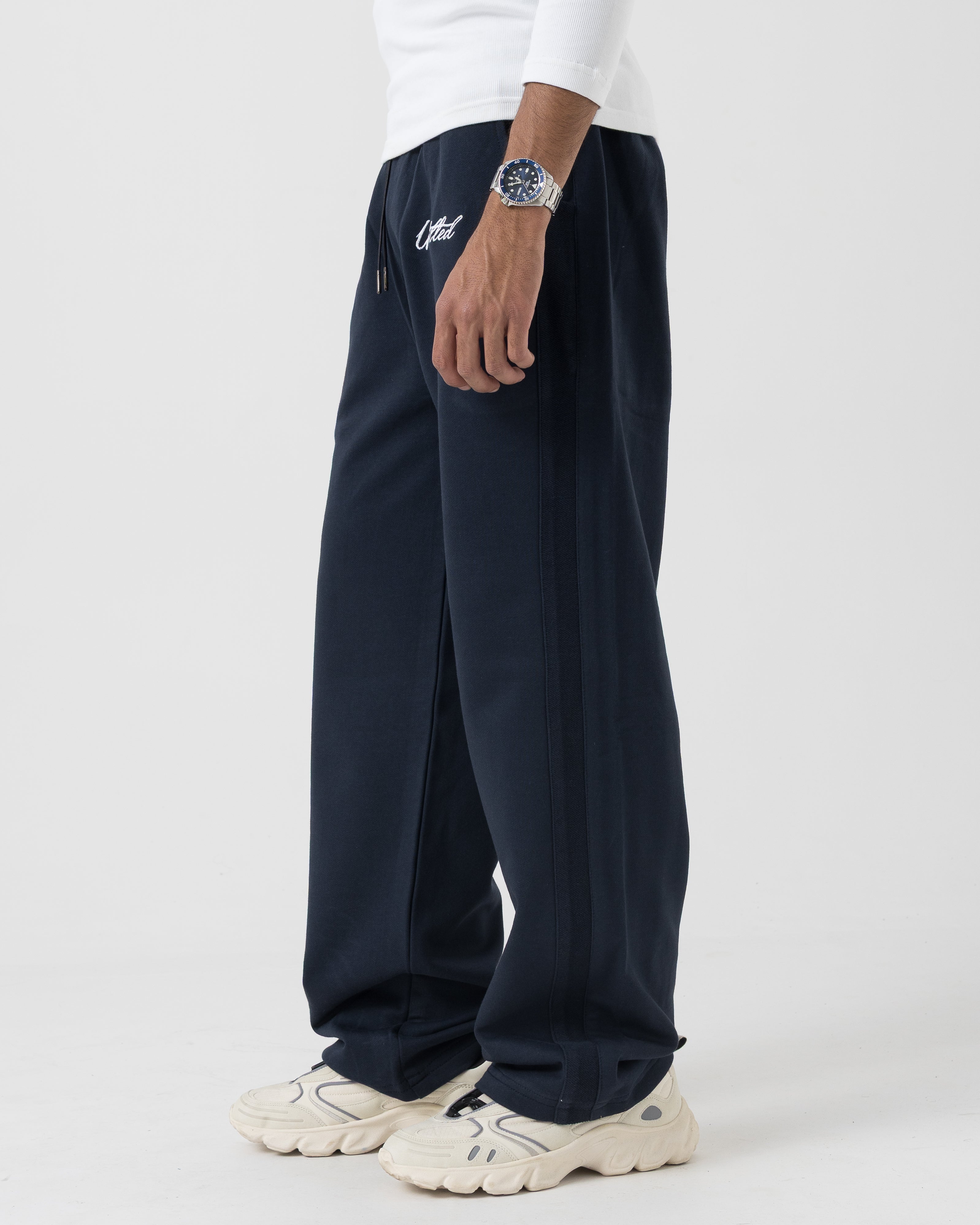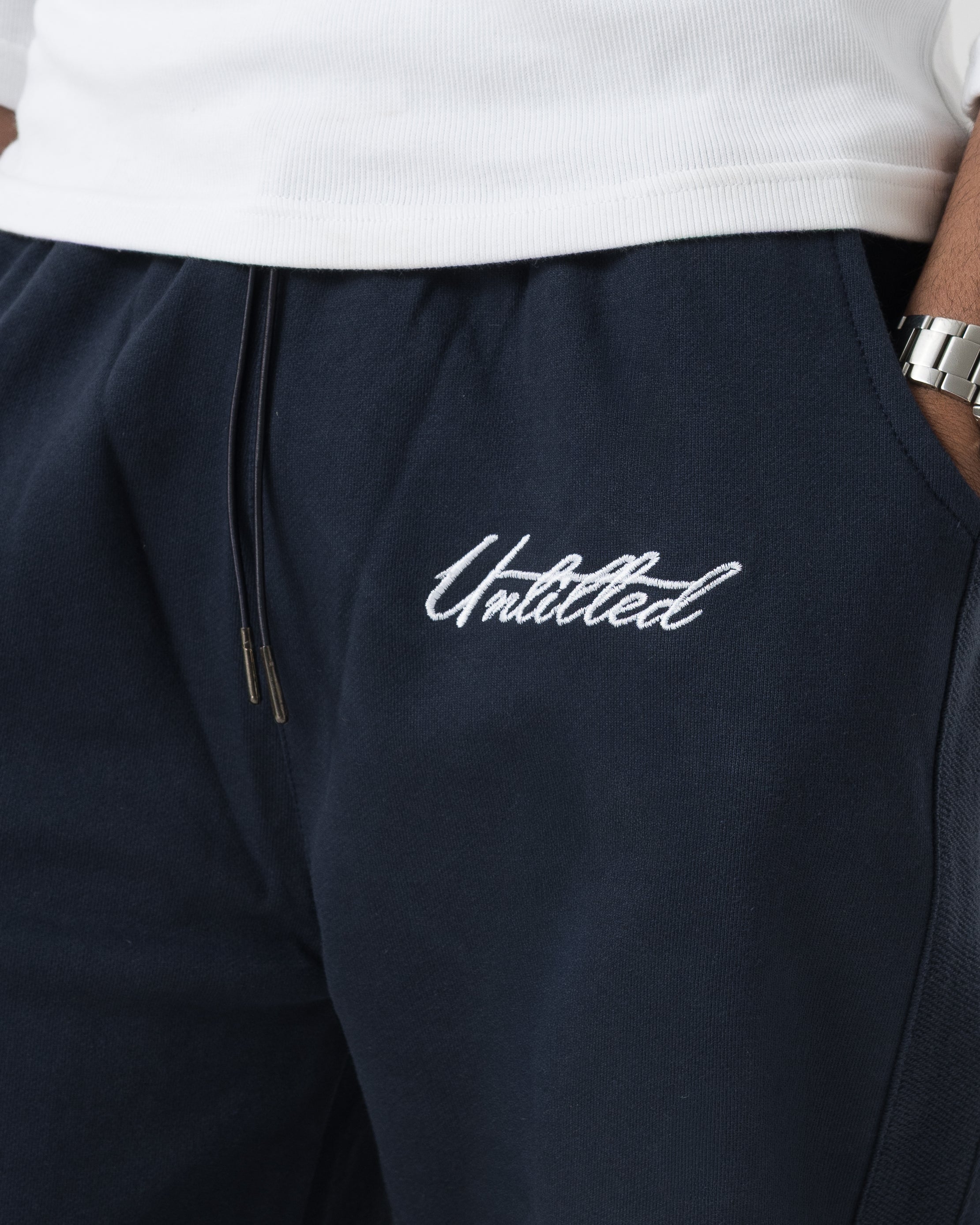 Clean, minimal silhouette with vertical seam detailing along the leg for added structure. Elasticated waistband with adjustable drawcord for a secure, flexible fit. Subtle Untld script logo near the pocket keeps the look understated and premium.