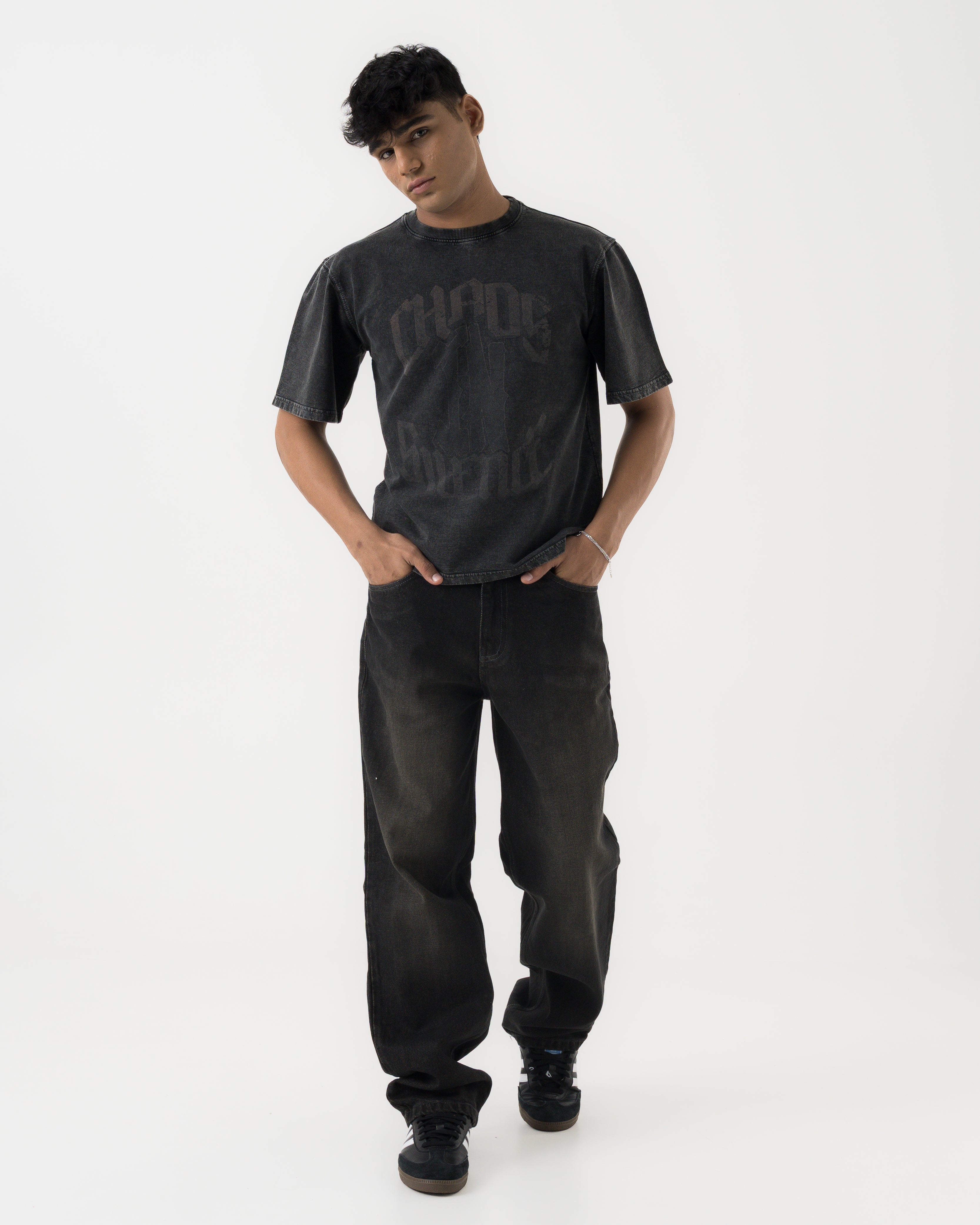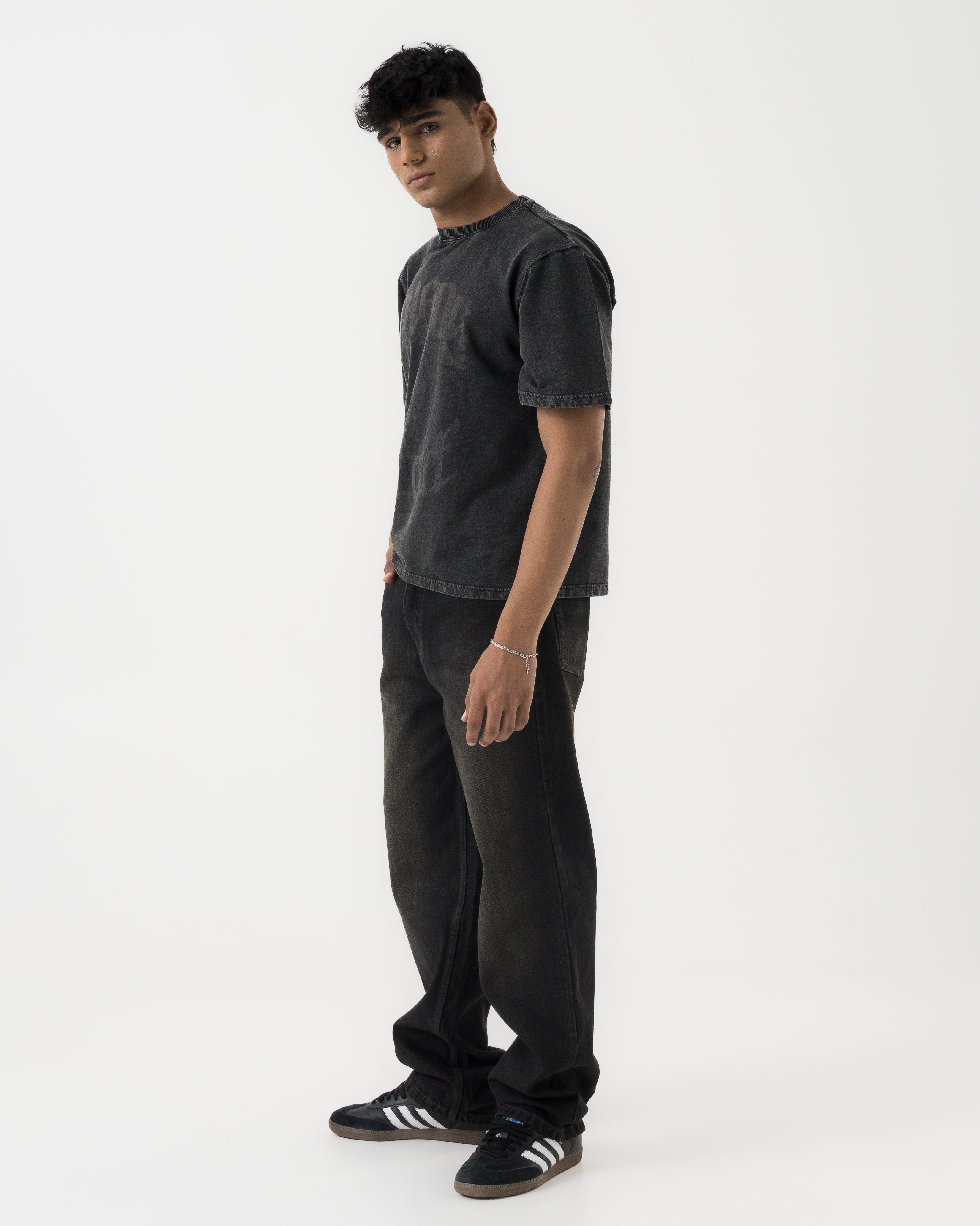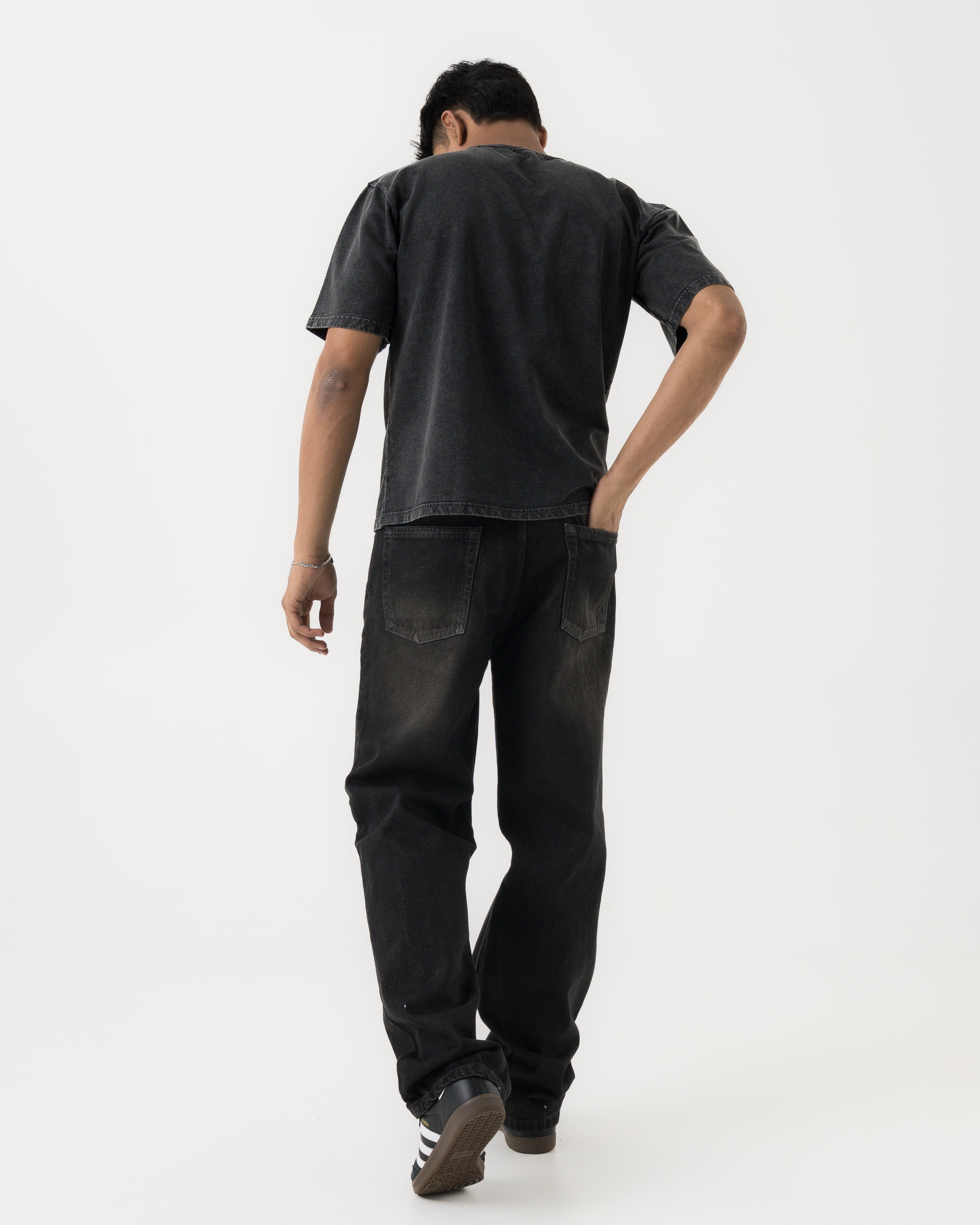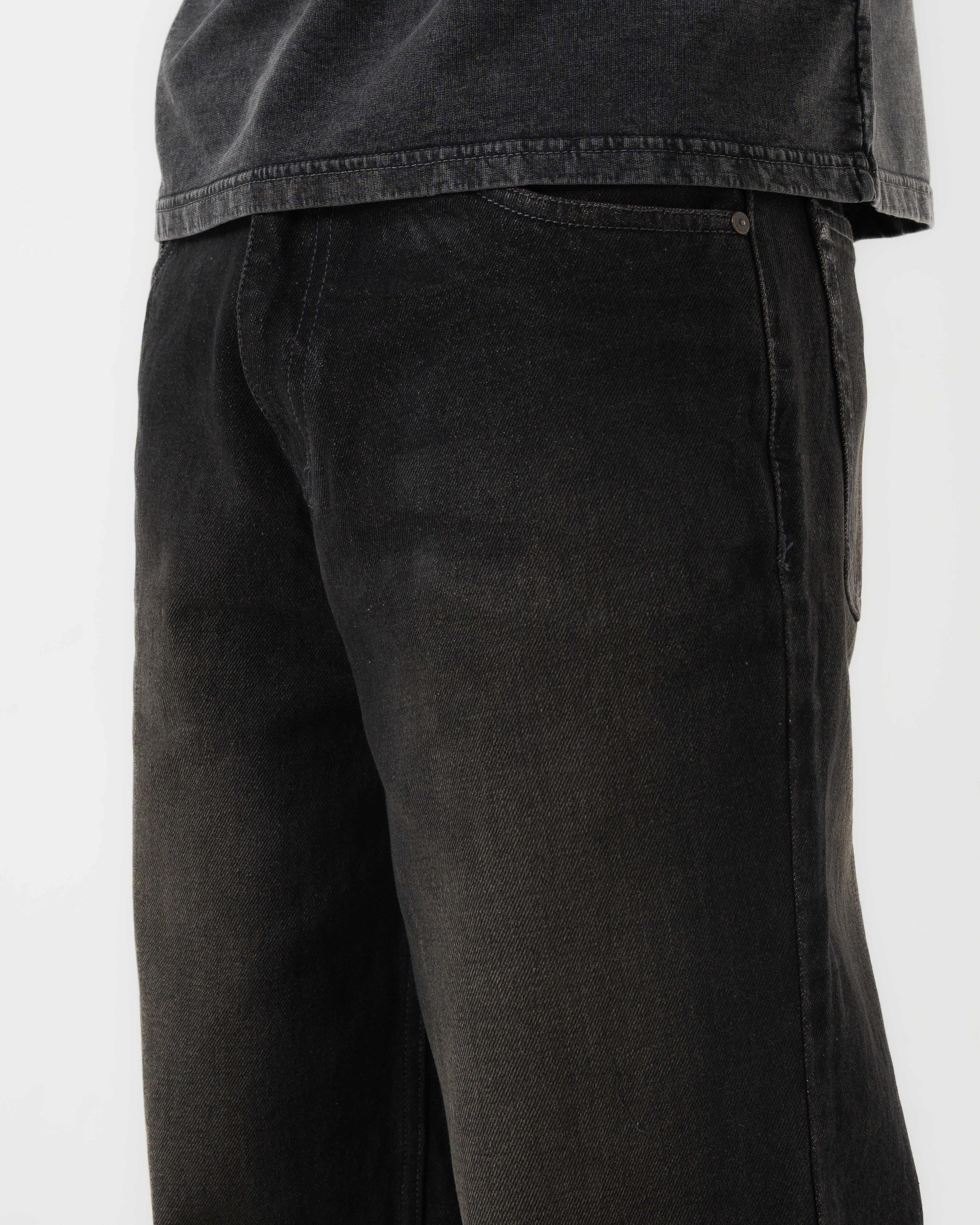 Crafted from mid-weight 100% cotton denim with a soft handfeel. The fabric has a subtle worn texture and mild stretch for comfort. Finished in a washed black tone that naturally fades with wear.